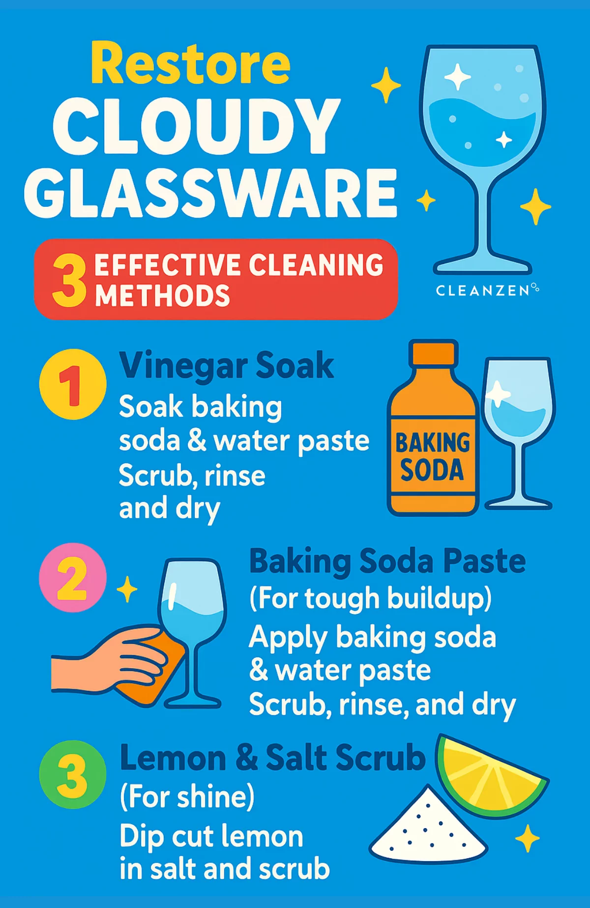 Then, make a paste out of baking soda and water. Apply the paste to the entire glass. Then, use a microfiber cloth dipped in vinegar to scrub away the remaining residue. Use hot water to rinse the glasses before drying them with a cloth.