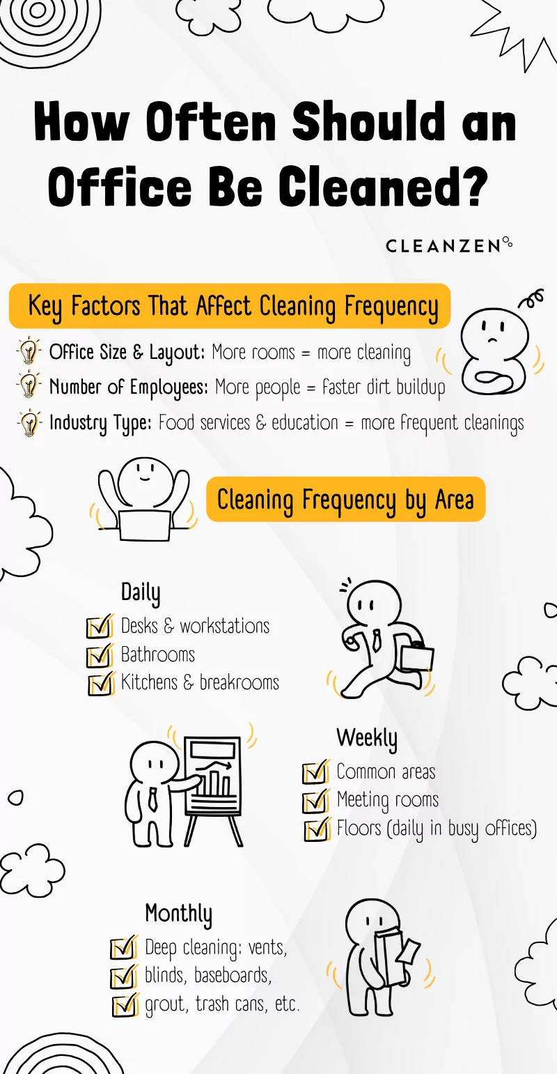 A dirty office also affects how your customers perceive your business. It often leads to a negative impression and contributes to an overall bad experience. Business owners often share the same question. How often should an office be cleaned?