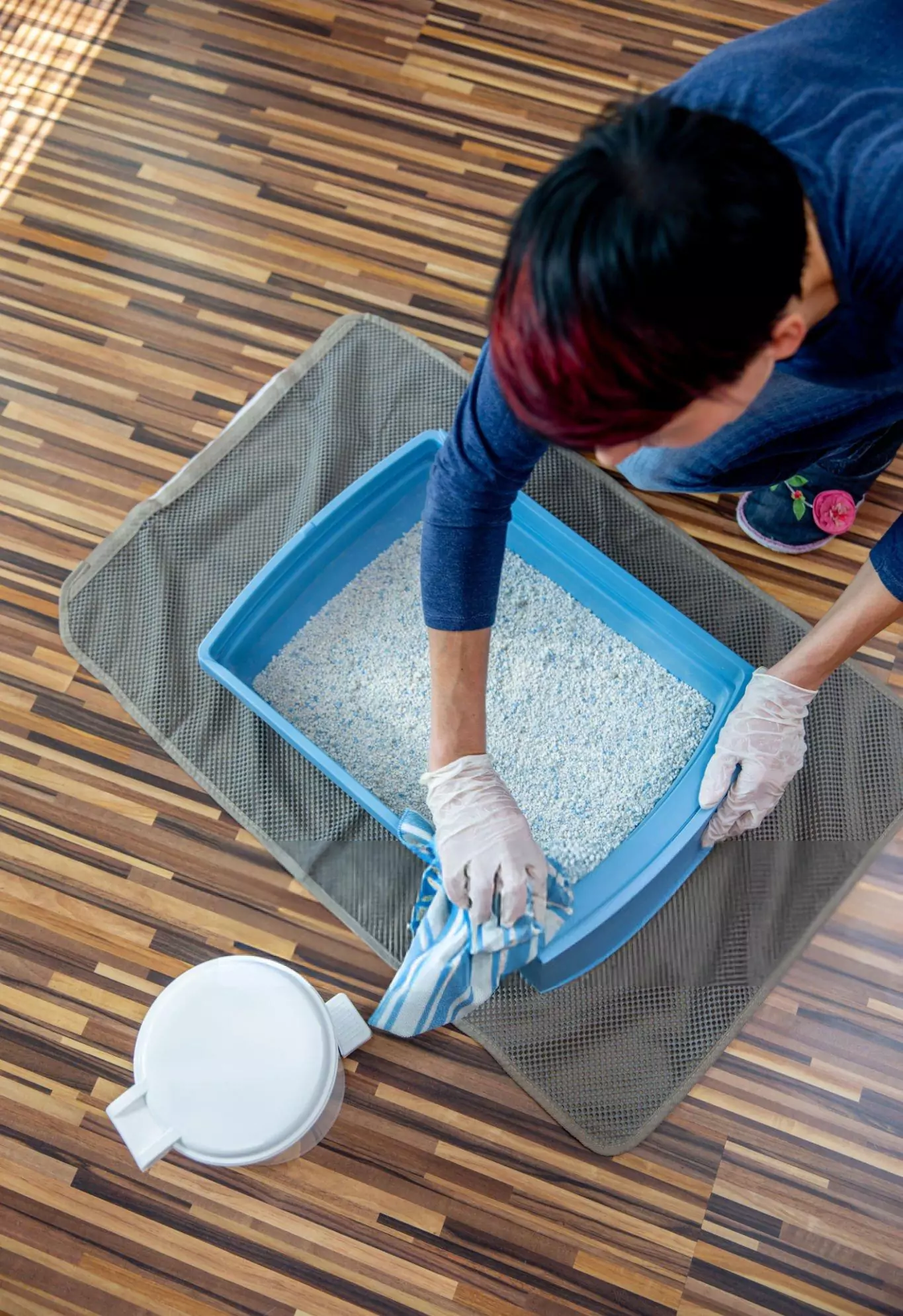 To clean your litter box, gather essential supplies. These include new cat litter, a litter scooper, a small trash bag, disposable gloves, dish soap, paper towels and baking soda litter deodorizer.
