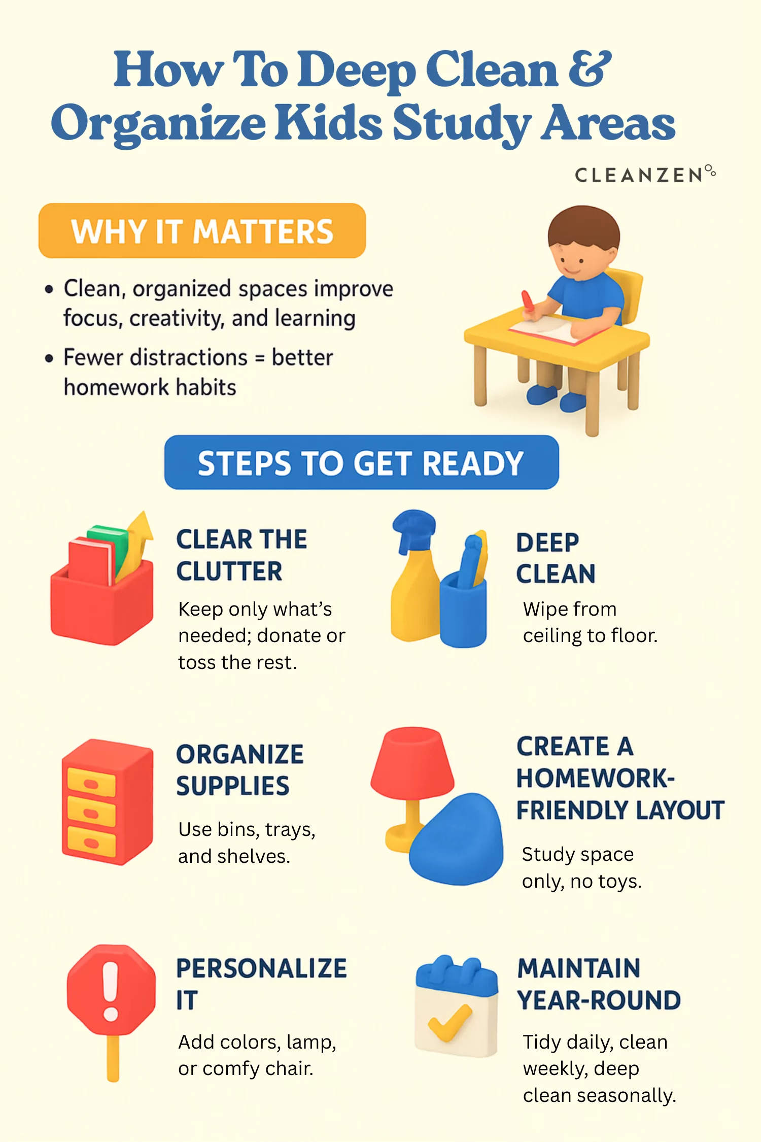 Back-to-school season is among the busiest times for parents. Between updating the kids’ wardrobes, buying school supplies, meeting teachers and more, it’s easy to put off important tasks. Like cleaning and organizing the kids’ study areas and bedrooms. With back to school cleaning service from Cleanzen, you can stay on top of house cleaning. Get your kids’ school year off to a great start.