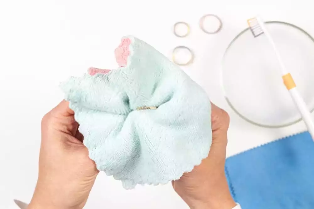 You should never wear dirty earrings because of the risk of infection, but there may be times when you do not have time to thoroughly clean the earrings that would look perfect with your outfit. You can settle for the fast cleaning method at this time, and you can follow this up with thorough cleaning at the end of the day. Before putting on the earrings, pour the rubbing alcohol or hydrogen peroxide directly on a clean cloth until it is saturated sufficiently. Use the cloth to wipe down each earring. Rinse them, and give them time to dry on a clean towel before putting them on.