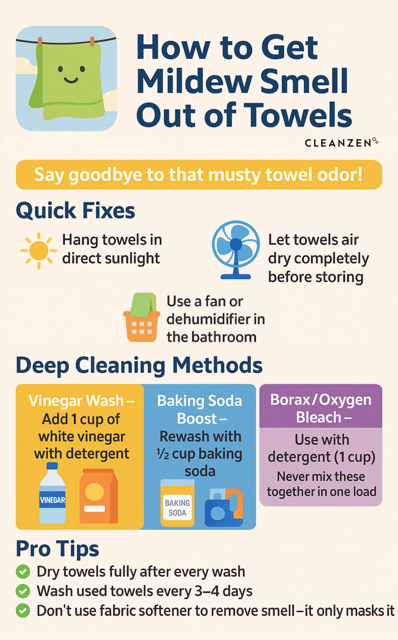 To eliminate an unpleasant mildew smell, you need to kill the mildew and bacteria growing on the towels. Fabric softener will only mask the smell. To get rid of the smell, you need to use white vinegar, baking soda, borax or oxygen bleach in the washing machine.