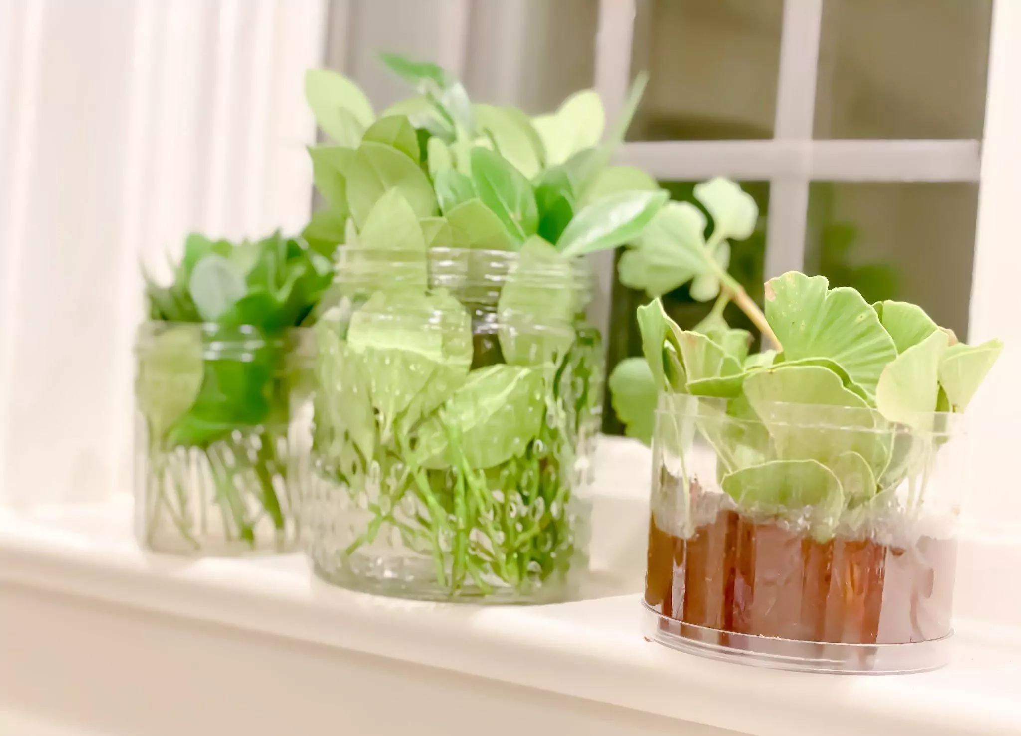 Glass jars can easily be filled with potting soil and used as growing containers for cilantro, thyme, basil, mint and others.