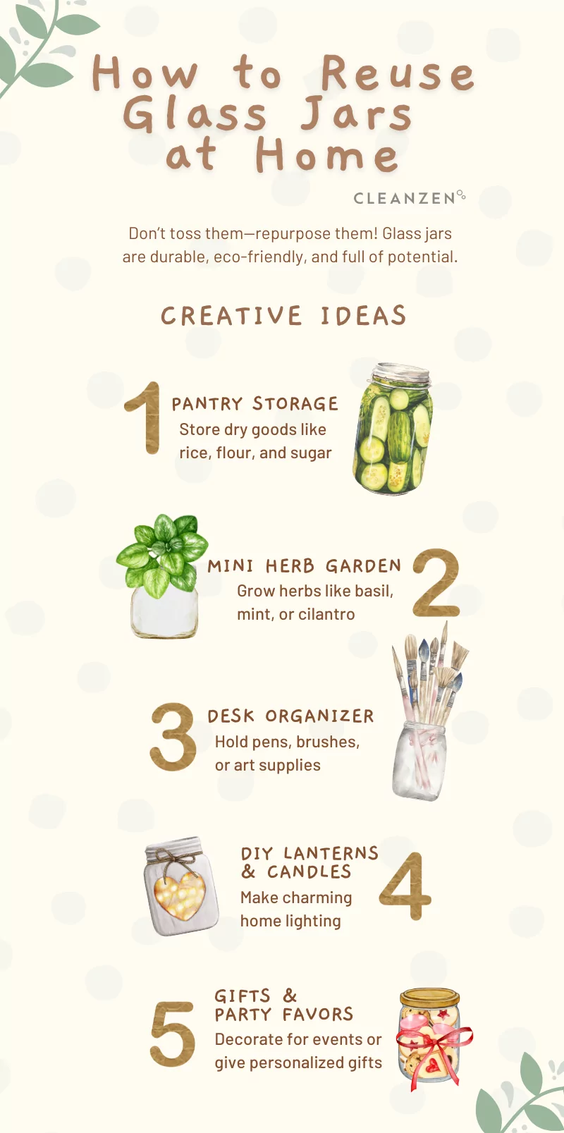 Glass jars are sturdy and can last for decades, and they have a variety of potential uses. By reusing glass jars, you can get the most life out of these useful containers.